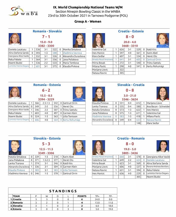 27. 10. 2021. Žene su jučer odigrale protiv reprezentacije Rumunjske s 2:0, 8:0 i 3805:3436 u čunjevima. Amela Nicol Imširović – Georgiana Alice Vasile 1:0 (3:0, 660:578), Valentina Gal – Daniela Lacatusu 1:0 (2:2, 649:624), Mirna Bosak – Alina Stefania Sanda 1:0 (3:0, 623:569), Marijana Liović – Roxana-Andreea Bordianu 1:0 (4:0, 606:537), Nataša Ravnić – Reka Fekete 1:0 (3:1, 631:594), Ines Maričić -. Luminita Viorica Dogaru/ Noemi Budoi 1:0 (4:0, 636:534)