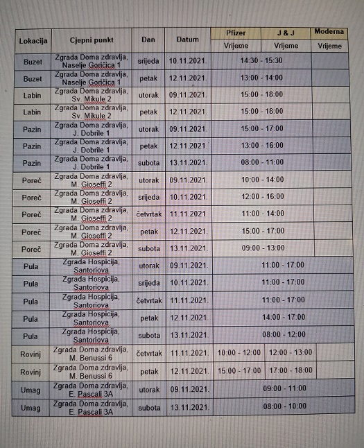 Danas se građani prvom dozom mogu cijepiti u Poreču, Puli i Rovinju – Mogu se cijepiti samo osobe koje do sada nisu cijepljene, a na cijepljenje je potrebno donijeti osobnu iskaznicu / putovnicu i karticu zdravstvenog osiguranja, pišu iz Zavoda za javno zdravstvo Istarske županije. Cijepljenju bez zakazanog termina može se pristupiti prema sljedećem rasporedu