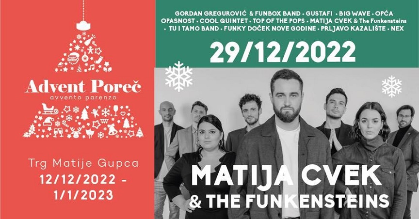 Advent Poreč ulazi u svoje samo finale, a prije samog dočeka Nove godine pripremio je bogat program za sve generacije, kao najbolju uvertiru u novogodišnji vikend. U četvrtak, 29. prosinca s početkom u 20 sati na scenu stupaju Matija Cvek i The Funkensteins.
