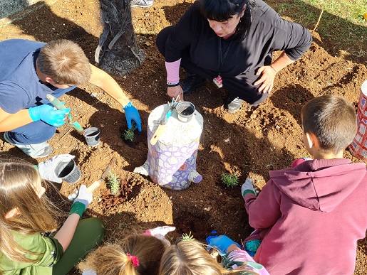 Radoičić je objasnila i demonstrirala vrijednoj ekipi kako pripremiti i „nahraniti“ tlo na ekološki prihvatljiv način, a zatim pravilno posaditi presadnice. Ružmarin će, tako, rasti oko ukrasnih panjeva, odnosno coka za sjedenje i razmišljanje koje su djeca prije nekoliko godina oslikala uz pomoć umjetnika Đanina Božića. Svaka biljka je označena ukrasnom pločicom na bambusovom štapiću, s imenom djeteta ili odraslog koji ju je posadio.