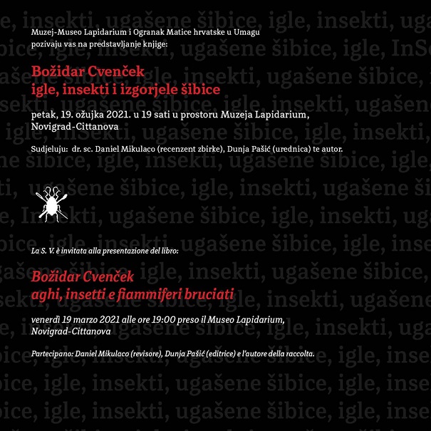 Svi ljubitelji poezije imat će priliku ovog petka, 19. ožujka, uživati u pjesničkoj večeri u prostoru Muzeja Lapidarium u Novigradu, gdje će se, s početkom u 19 sati, održati predstavljanje zbirke pjesama Božidara Cvenčeka, „Igle, insekti i izgorjele šibice”.