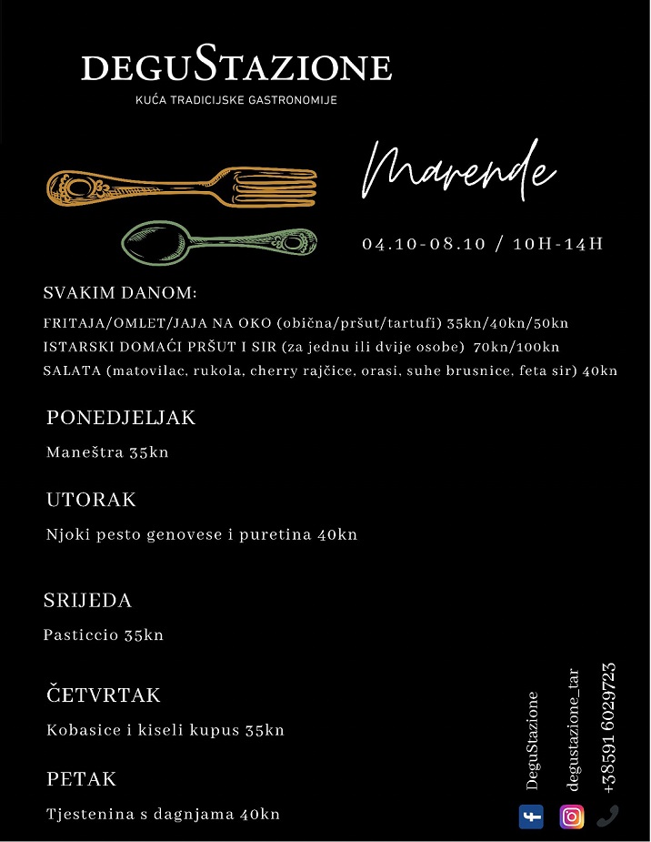 Marende su u ponudi od 10 do 14 sati, nakon čega slijedi popodnevna i večernja ponuda jela. Broj za narudžbu marendi je 091-6029723. Više pogledajte u fotografiji u prilogu ili posjetite njihov profil na Facebooku i Instagramu https://web.facebook.com/DeguStazioneTar