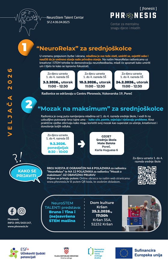 U Centru Phronesis u Poreču održavaju se radionice NeuroRelax za srednjoškolce (3.2., 10.2. i 24.2. od 11:00 do 12:30) koje kroz kreativne i STEM tehnike te demonstraciju neurofeedbacka uče mlade kako umiriti um i tijelo te se kvalitetno fokusirati.