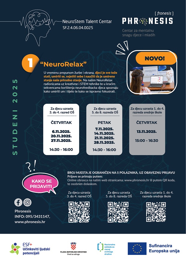 U vremenu prepunom žurbe i ekrana, djeci je sve teže stati, umiriti se, osjetiti sebe i naučiti da je umireno stanje zapravo naše prirodno stanje. Upravo zato Centar Phronesis u studenom uvodi novi modul radionica NeuroRelax u kojem kroz kreativne aktivnosti i STEM tehnike, djeca spoznaju kako se umiriti i fokusirati.