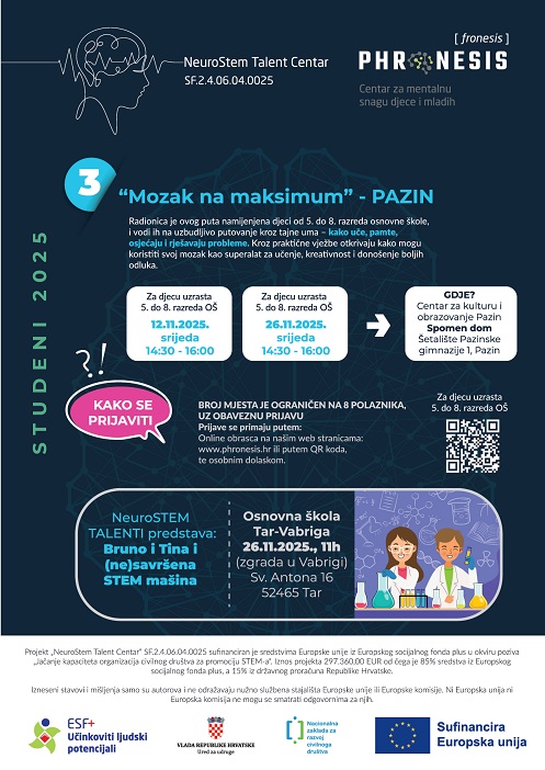 No, to nije sve. U sklopu projekta NeuroSTEM Talent Centar, osim radionica, održat će se i edukativno-zabavna STEM predstava za djecu pod nazivom “Bruno i Tina i njihova (ne)savršena STEM mašina”. U duhovitoj i interaktivnoj izvedbi, predstava na zanimljiv način približava djeci svijet mozga, emocija i znanosti, pokazujući im da najbolje rezultate postižemo kada zajedno rade i glava i srce. Predstava će se održati u Osnovnoj školi Tar-Vabriga (zgrada u Vabrigi), na adresi Sv. Antona 16 u Taru, 26. studenog 2025. godine u 11 sati.