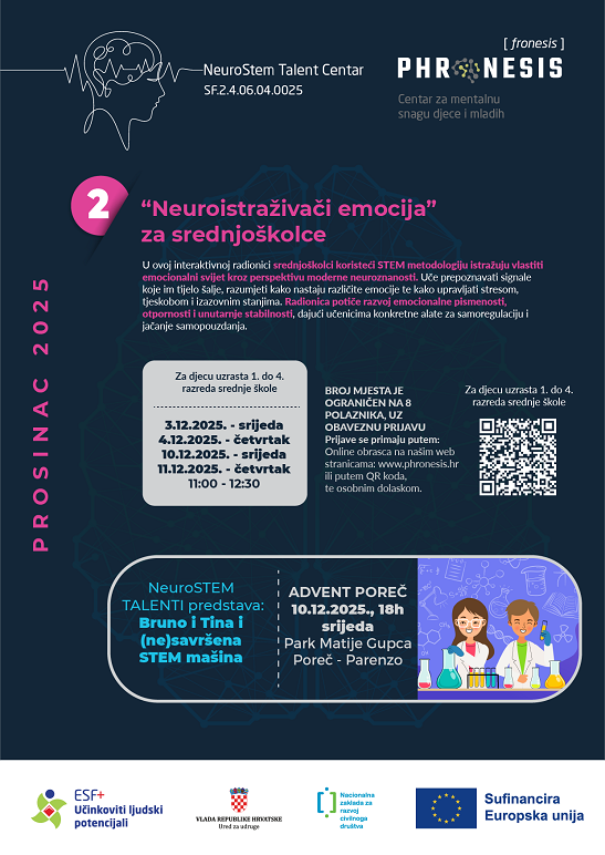 Centar Phronesis najavljuje novi prosinački ciklus edukativnih aktivnosti za djecu i mlade u sklopu projekta NeuroSTEM Talent Centar. Ovoga puta fokus je na razumijevanju emocija kroz suvremene metode neuroznanosti, biofeedback tehnologiju i interaktivne STEM sadržaje.