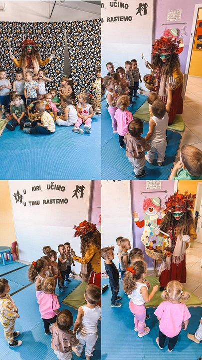 Djeca su uz pjesmice, recitacije i stihove posvećene jesenskim plodovima i bojama prirode ispunila šumski kutak vrtića radošću i smijehom. U atmosferi topline i mašte, mališani su Tetom Jesenki prenijeli poruku o prijateljstvu, dok je ona njima uzvratila darom – punom košarom mirisnih mandarina i raznovrsnih jesenskih plodova.