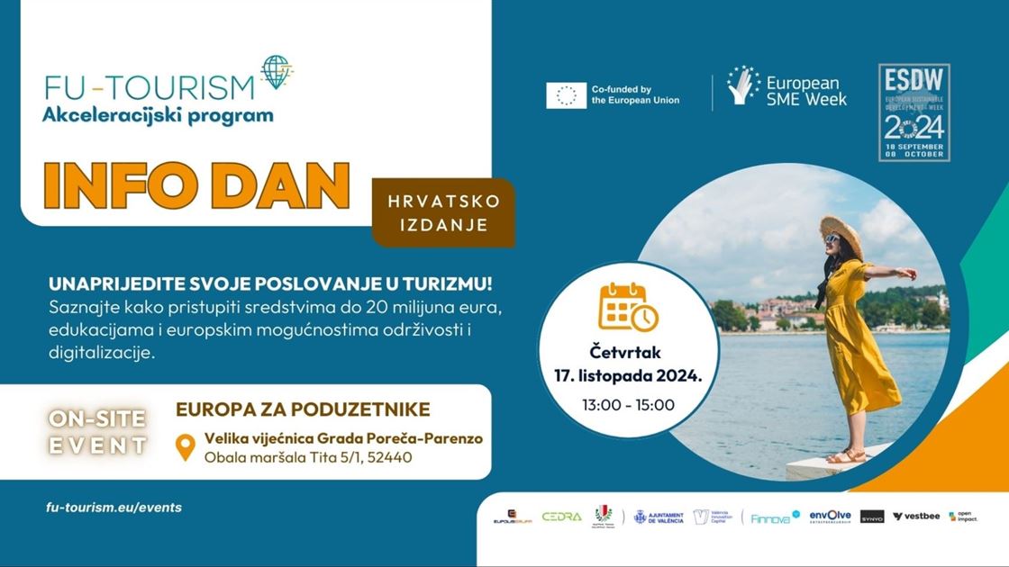 Grad Poreč osmislio je događanje koje će se održati u četvrtak 17. listopada 2024. od 13:00 do 15:00 sati, u Velikoj vijećnici, a bit će namijenjeno poduzetnicima iz sektora turizma i svih povezanih djelatnosti. Program će uključivati besplatnu mini edukaciju o osnovama prijave i provedbe EU projekata, te prezentaciju projekta FU-TOURISM koji Grad Poreč-Parenzo provodi u okviru Programa jedinstvenog tržišta (nekadašnji COSME). Također, predstavit će se pravila sudjelovanja u Akceleracijskom programu projekta FU-TOURISM, koji će pružiti financijsku podršku za 60 malih i srednjih poduzeća iz Hrvatske, Grčke, Poljske, Španjolske, Belgije i Austrije (po 10 iz svake zemlje sudionice), u iznosu od 20.000 eura.