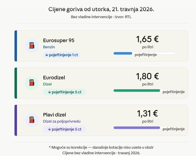 Vozače u Hrvatskoj od utorka, 21. travnja, očekuju nešto niže cijene goriva. Prema informacijama koje je objavio RTL Danas, benzin i dizel trebali bi blago pojeftiniti, i to bez dodatne intervencije države.