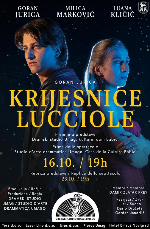 Umag – U Kulturnom domu Babići 16. listopada 2025. upalila su se svjetla nove kazališne scene. Pred prepunom dvoranom Dramski studio Umag izveo je predstavu Krijesnice/Lucciole Gorana Jurice, u kojoj su nastupili polaznici studija Goran Jurica, Luana Kličko i Milica Marković.