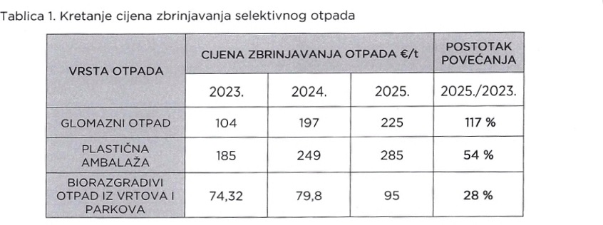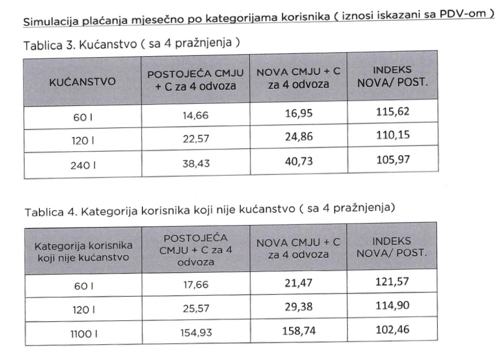 Konkretno, za građane koji imaju spremnike od 120 litara i četiri pražnjenja mjesečno cijena će umjesto dosadašnjih 22,57 eura biti 24,86 eura. Poduzetnici će pak za istu količinu otpada plaćati 29,38 eura umjesto dosadašnjih 25,57 eura.