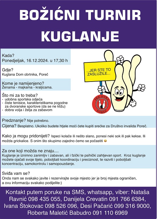 Ženski kuglački klub Istra Poreč poziva sve ljubitelje kuglanja, zabave i zajedništva na Božićni turnir, koji će se održati u kuglani Dom obrtnika u Poreču, u ponedjeljak, 16. prosinca 2024., s početkom u 17:30 sati.