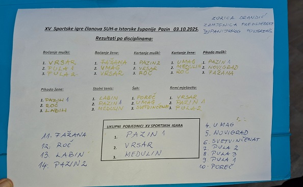 Ovoga puta natjecateljski duh pokazali su na sportskim igrama koje su okupile oko 250 sudionika – natjecatelja, voditelja i sudaca – iz podružnica Fažana, Labin, Medulin, Novigrad, Pazin, Poreč, Pula, Roč, Svetvinčenat, Umag i Vrsar.