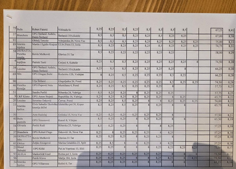 I ove godine manifestacija je potvrdila veliki interes maslinara, budući da je na ocjenjivanje zaprimljeno ukupno 96 uzoraka maslinovog ulja, od čega je čak 85 nagrađeno zlatnom medaljom za ekstra djevičansku kvalitetu.