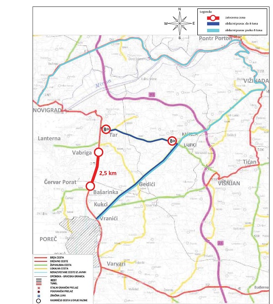 Obilazni pravac u oba smjera osiguran je preko Tara i Kaštelira za vozila nosivosti do 8 tona, a preko Novigrada, Ponte Portona, Vižinade i Kaštelira za vozila peko 8 tona, odgovorili su na naš upit iz Hrvatskih cesta.