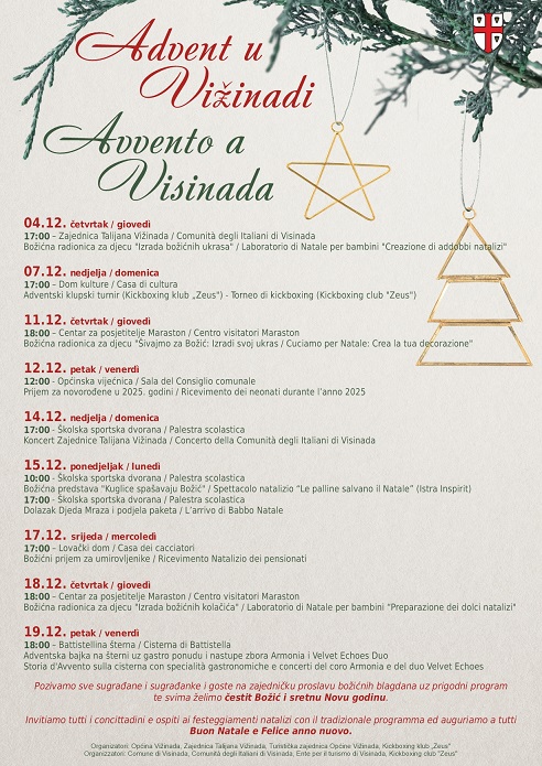 Program započinje 4. prosinca u 17:00 sati u prostoru Zajednice Talijana Vižinada, gdje najmlađe očekuje božićna radionica izrade ukrasa. U sportskom duhu nastavljamo 7. prosinca u 17:00 sati u Domu kulture, uz adventski klupski turnir Kickboxing kluba „Zeus“.
