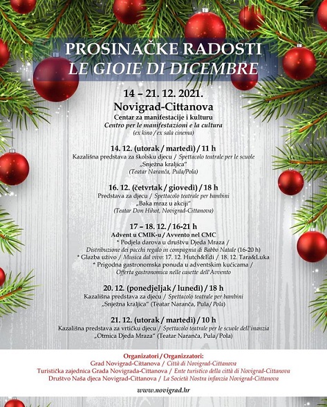 Prosinačke radosti u Novigradu počinju 14. prosinca u 11 sati. Donosimo bogat program koji su pripremili Grad Novigrad, Turistička zajednica i Društvo Naša djeca Novigrad. Mjesto održavanja je Centar za manifestacije i kulturu – CMIK (biše kino).