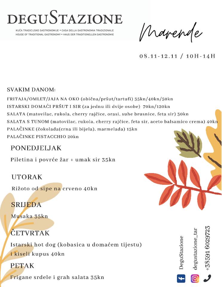 Marende su u ponudi od 10 do 14 sati, nakon čega slijedi popodnevna i večernja ponuda jela. Broj za narudžbu marendi je 091-6029723. Više pogledajte u fotografiji u prilogu ili posjetite njihov profil na Facebooku i Instagramu https://web.facebook.com/DeguStazioneTar
